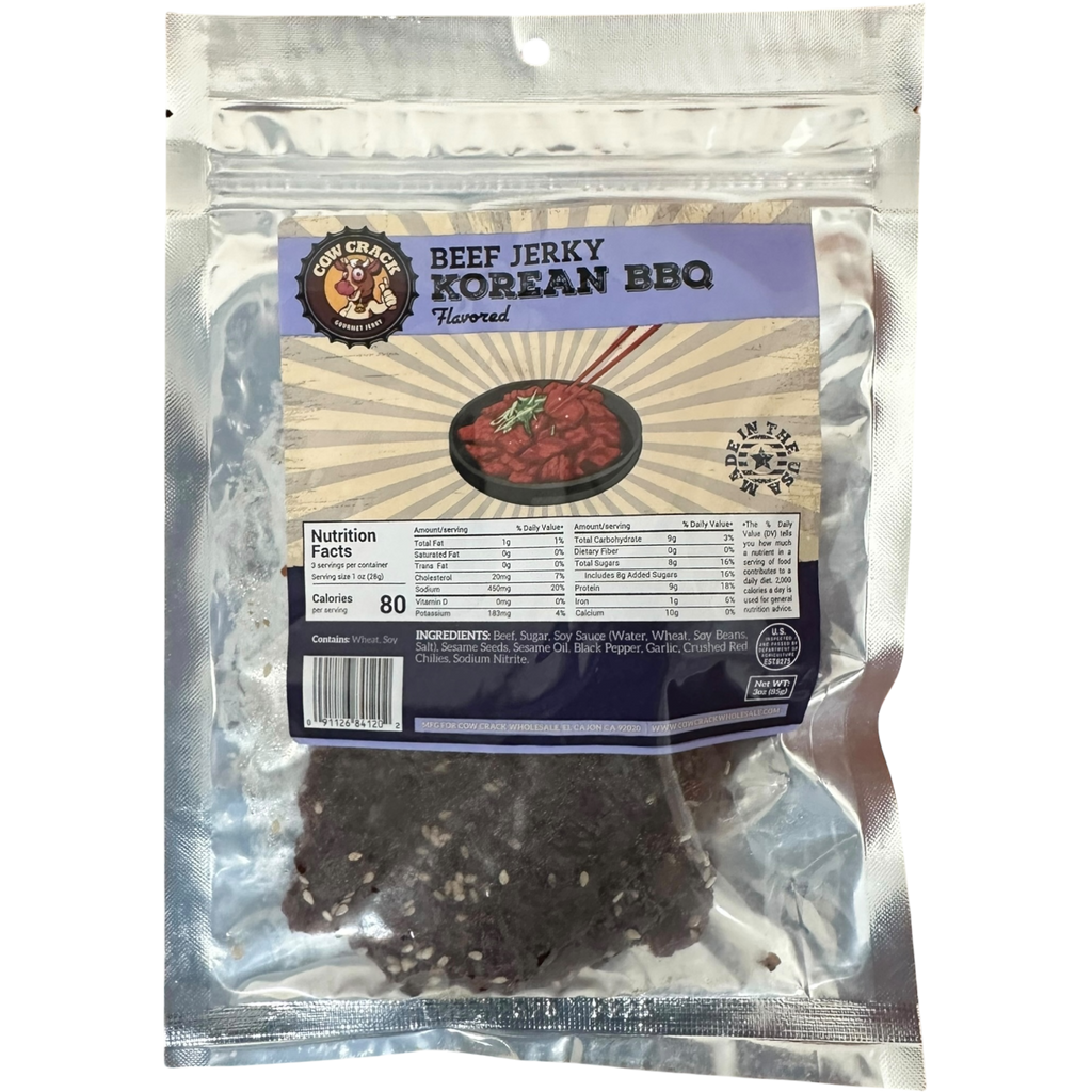 Cow Crack Korean BBQ Beef Jerky brings bold, mouthwatering flavor in every bite! Made in the USA and hand-crafted in small batches, we use USDA Select Top Round for a tender, juicy chew. Infused with the perfect blend of sweet, smoky, and savory Korean BBQ flavors, this jerky is made with the finest quality ingredients. If you love that rich, umami-packed taste with a hint of sesame and spice, this one’s a must-try!
